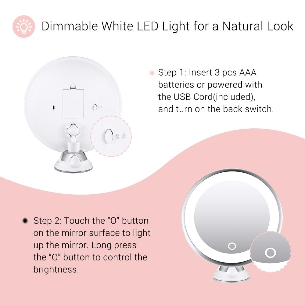•DOUBLE POWER SUPPLY: Operated by 4 pcs AAA batteries (not included) or USB cord (included). Please note the mirror is not rechargeable.
